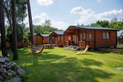 W każdym domku są 3 pomieszczenia, łazienka z prysznicem i ciepłą wodą, 2-3 osobowa sypialnia oraz salon z rozkładaną kanapą (140x200). Znajduje się w pełni wyposażony aneks kuchenny (sztućce, szklanki, talerze), lodówka, kuchenka gazowa, czajnik, ponadto telewizor, dostępne jest także WiFi. Przy każdym domku dostępny jest grill (węgiel we własnym zakresie), na terenie ośrodka znajduje się zadaszony stół biesiadny i miejsce na ognisko. Każdy domek ma własny taras ze stolikiem i krzesłami.